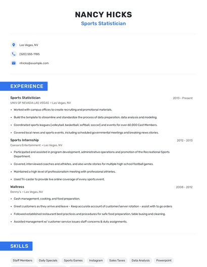Build a professional sports statistician resume in minutes. Our AI resume writing assistant will guide you through every step of the process, and you can choose from 10+ resume templates to create your sports statistician resume.What skills help Sports Statisticians find jobs?
