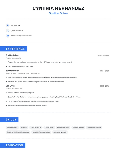 Build a professional spotter driver resume in minutes. Browse through our resume examples to identify the best way to word your resume. Then choose from 5+ resume templates to create your spotter driver resume.