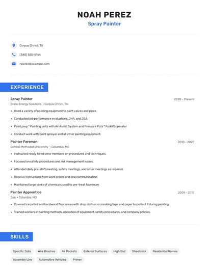 Build a professional spray painter resume in minutes. Browse through our resume examples to identify the best way to word your resume. Then choose from 5+ resume templates to create your spray painter resume.