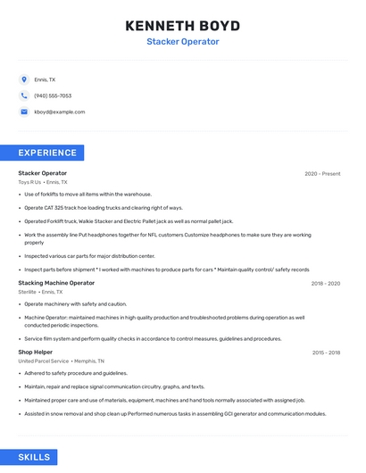 The most important skills for a stacker operator resume and required skills for a stacker operator to have include: