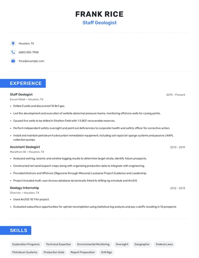 Build a professional staff geologist resume in minutes. Browse through our resume examples to identify the best way to word your resume. Then choose from 5+ resume templates to create your staff geologist resume.