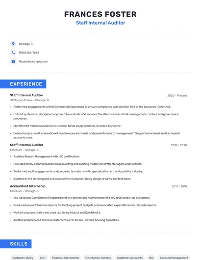 Build a professional staff internal auditor resume in minutes. Browse through our resume examples to identify the best way to word your resume. Then choose from 5+ resume templates to create your staff internal auditor resume.