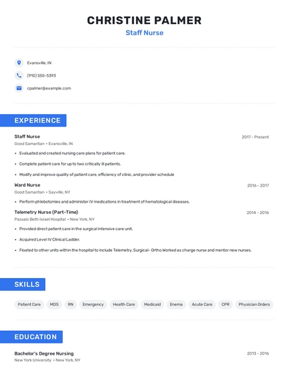 Build a professional staff nurse resume in minutes. Browse through our resume examples to identify the best way to word your resume. Then choose from 5+ resume templates to create your staff nurse resume.