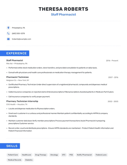 Build a professional staff pharmacist resume in minutes. Browse through our resume examples to identify the best way to word your resume. Then choose from 5+ resume templates to create your staff pharmacist resume.