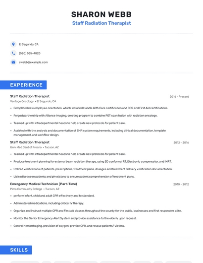 Build a professional staff radiation therapist resume in minutes. Browse through our resume examples to identify the best way to word your resume. Then choose from 5+ resume templates to create your staff radiation therapist resume.