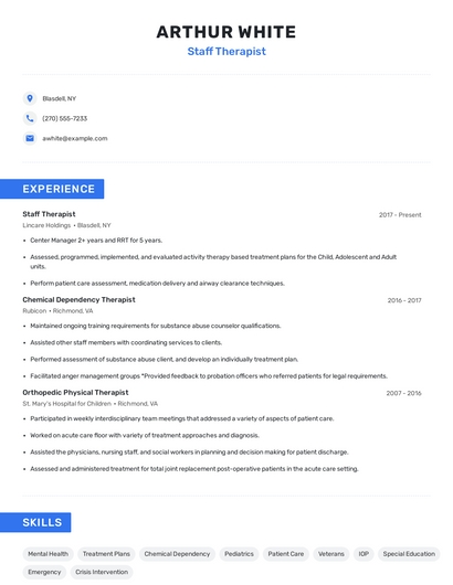 Build a professional staff therapist resume in minutes. Browse through our resume examples to identify the best way to word your resume. Then choose from 5+ resume templates to create your staff therapist resume.