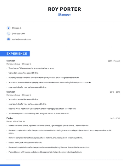 Build a professional stamper resume in minutes. Our AI resume writing assistant will guide you through every step of the process, and you can choose from 10+ resume templates to create your stamper resume.7. Quality Standards