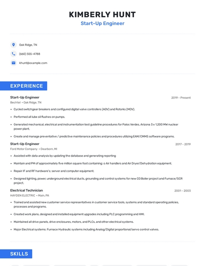 Build a professional start-up engineer resume in minutes. Browse through our resume examples to identify the best way to word your resume. Then choose from 5+ resume templates to create your start-up engineer resume.