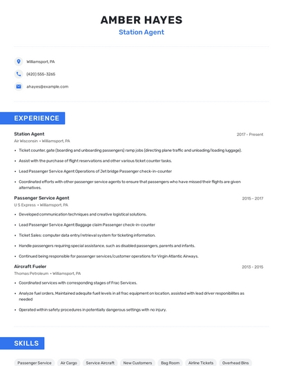 Build a professional station agent resume in minutes. Our AI resume writing assistant will guide you through every step of the process, and you can choose from 10+ resume templates to create your station agent resume.7. Air Travel