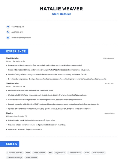 Build a professional steel detailer resume in minutes. Browse through our resume examples to identify the best way to word your resume. Then choose from 5+ resume templates to create your steel detailer resume.