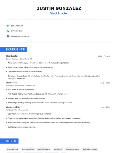 Build a professional steel erector resume in minutes. Browse through our resume examples to identify the best way to word your resume. Then choose from 5+ resume templates to create your steel erector resume.