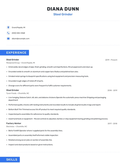 The most important skills for a steel grinder resume and required skills for a steel grinder to have include: