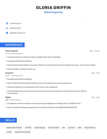 Build a professional steel inspector resume in minutes. Browse through our resume examples to identify the best way to word your resume. Then choose from 5+ resume templates to create your steel inspector resume.