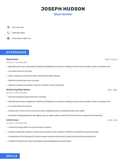 Build a professional steel worker resume in minutes. Browse through our resume examples to identify the best way to word your resume. Then choose from 5+ resume templates to create your steel worker resume.