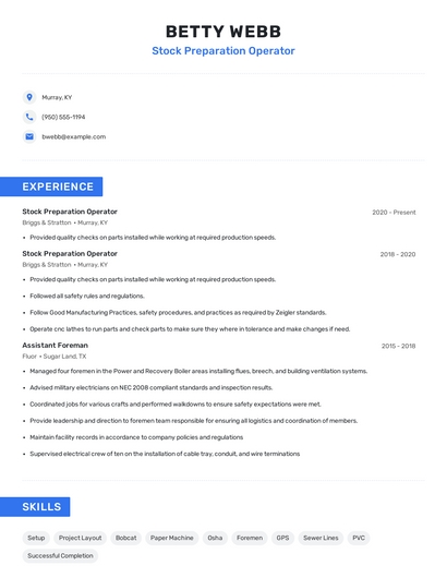 Build a professional stock preparation operator resume in minutes. Our AI resume writing assistant will guide you through every step of the process, and you can choose from 10+ resume templates to create your stock preparation operator resume.7. Routine Maintenance
