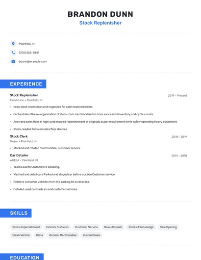Build a professional stock replenisher resume in minutes. Browse through our resume examples to identify the best way to word your resume. Then choose from 5+ resume templates to create your stock replenisher resume.