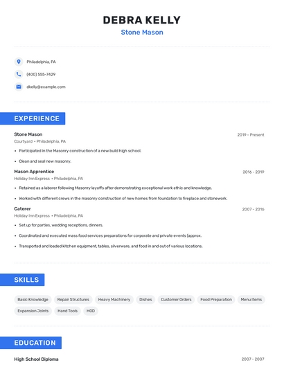 Build a professional stone mason resume in minutes. Browse through our resume examples to identify the best way to word your resume. Then choose from 5+ resume templates to create your stone mason resume.