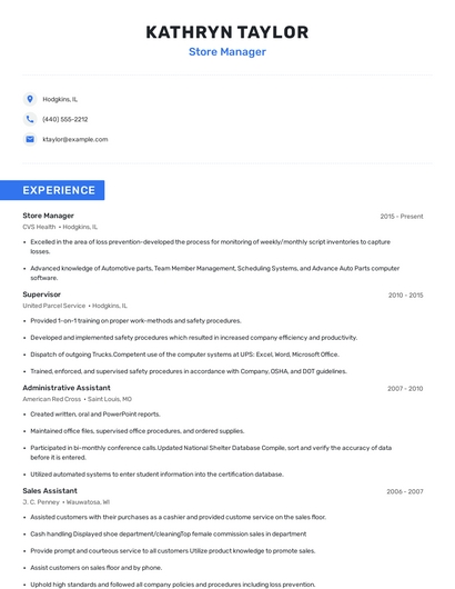 Build a professional store manager resume in minutes. Browse through our resume examples to identify the best way to word your resume. Then choose from 5+ resume templates to create your store manager resume.