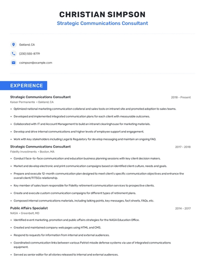 Build a professional strategic communications consultant resume in minutes. Browse through our resume examples to identify the best way to word your resume. Then choose from 5+ resume templates to create your strategic communications consultant resume.