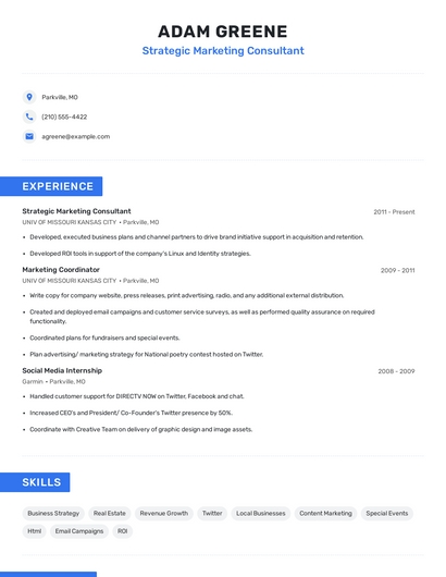 Build a professional strategic marketing consultant resume in minutes. Browse through our resume examples to identify the best way to word your resume. Then choose from 5+ resume templates to create your strategic marketing consultant resume.