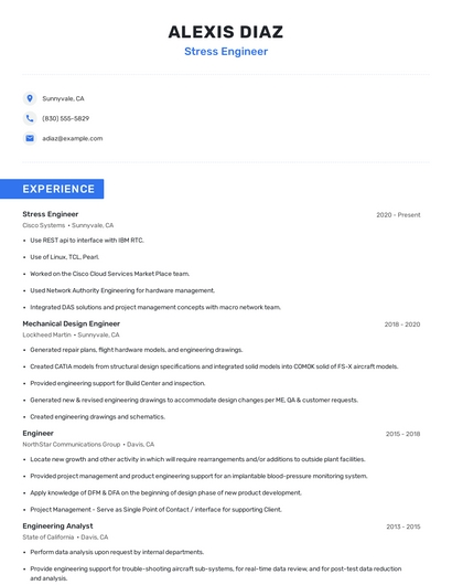 Build a professional stress engineer resume in minutes. Browse through our resume examples to identify the best way to word your resume. Then choose from 5+ resume templates to create your stress engineer resume.