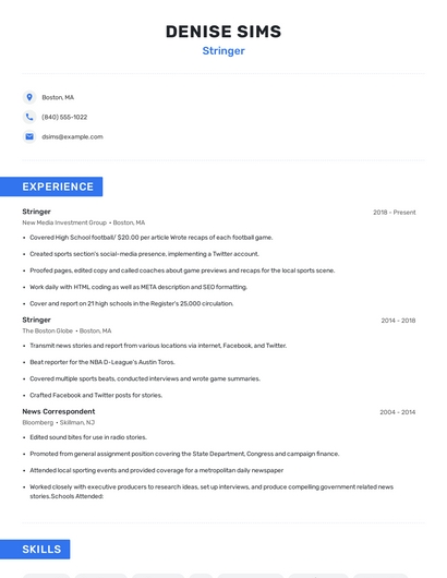 Build a professional stringer resume in minutes. Browse through our resume examples to identify the best way to word your resume. Then choose from 5+ resume templates to create your stringer resume.