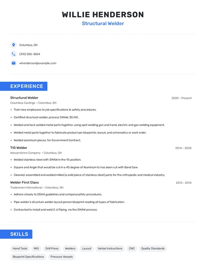Build a professional structural welder resume in minutes. Browse through our resume examples to identify the best way to word your resume. Then choose from 5+ resume templates to create your structural welder resume.