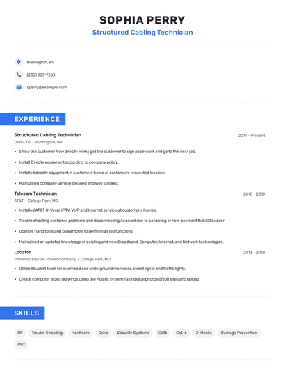 Build a professional structured cabling technician resume in minutes. Browse through our resume examples to identify the best way to word your resume. Then choose from 5+ resume templates to create your structured cabling technician resume.