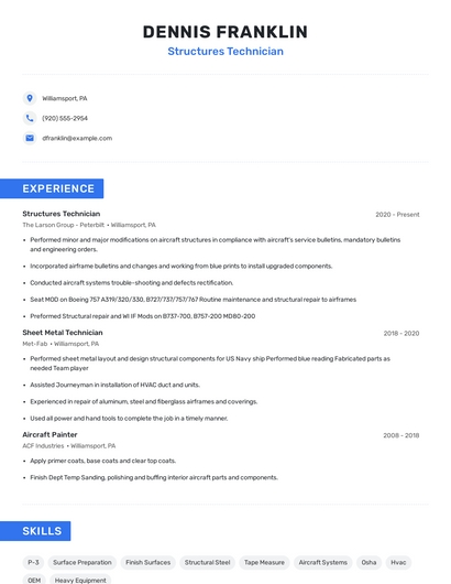 Build a professional structures technician resume in minutes. Browse through our resume examples to identify the best way to word your resume. Then choose from 5+ resume templates to create your structures technician resume.
