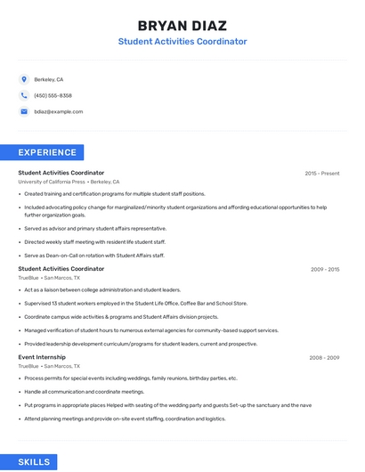 Build a professional student activities coordinator resume in minutes. Browse through our resume examples to identify the best way to word your resume. Then choose from 5+ resume templates to create your student activities coordinator resume.