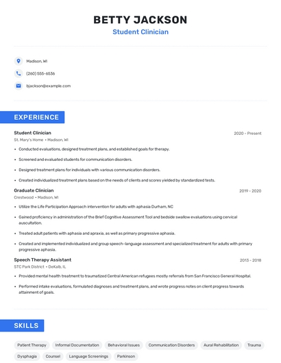 Build a professional student clinician resume in minutes. Our AI resume writing assistant will guide you through every step of the process, and you can choose from 10+ resume templates to create your student clinician resume.7. Expressive Language