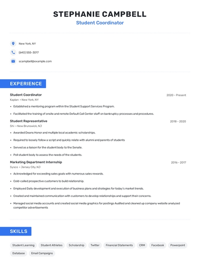 Build a professional student coordinator resume in minutes. Browse through our resume examples to identify the best way to word your resume. Then choose from 5+ resume templates to create your student coordinator resume.