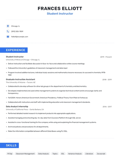 Build a professional student instructor resume in minutes. Browse through our resume examples to identify the best way to word your resume. Then choose from 5+ resume templates to create your student instructor resume.