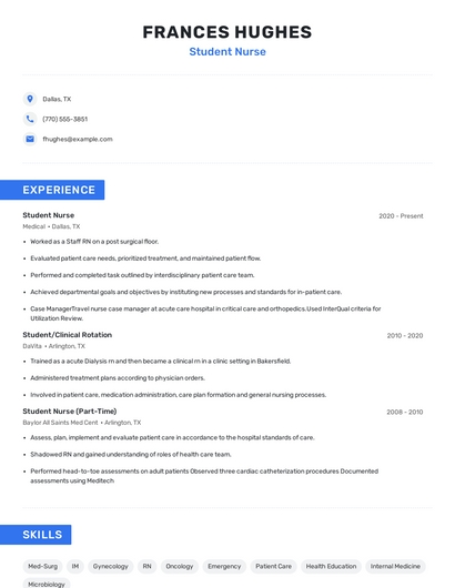Build a professional student nurse resume in minutes. Our AI resume writing assistant will guide you through every step of the process, and you can choose from 10+ resume templates to create your student nurse resume.7. Med-Surg