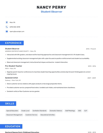 Build a professional student observer resume in minutes. Browse through our resume examples to identify the best way to word your resume. Then choose from 5+ resume templates to create your student observer resume.