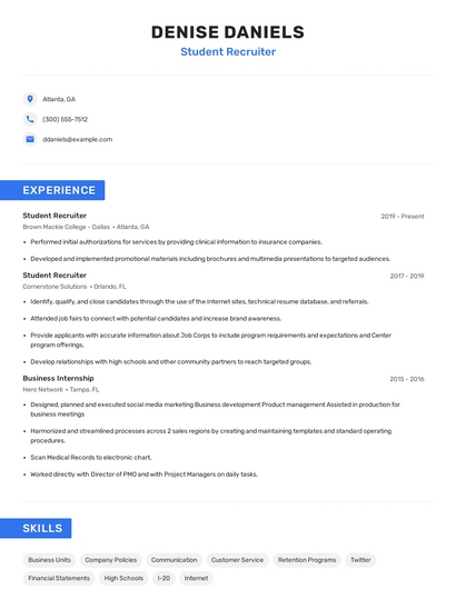 Build a professional student recruiter resume in minutes. Browse through our resume examples to identify the best way to word your resume. Then choose from 5+ resume templates to create your student recruiter resume.