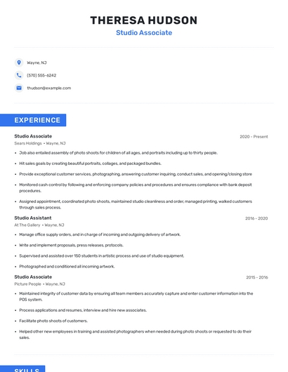 Build a professional studio associate resume in minutes. Browse through our resume examples to identify the best way to word your resume. Then choose from 5+ resume templates to create your studio associate resume.