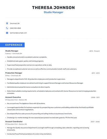 Build a professional studio manager resume in minutes. Browse through our resume examples to identify the best way to word your resume. Then choose from 5+ resume templates to create your studio manager resume.