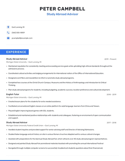 Build a professional study abroad advisor resume in minutes. Browse through our resume examples to identify the best way to word your resume. Then choose from 5+ resume templates to create your study abroad advisor resume.