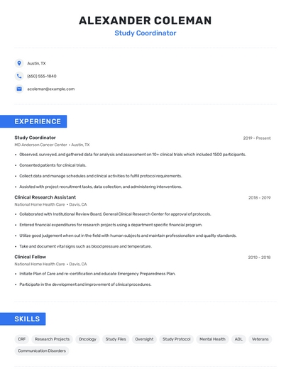 Build a professional study coordinator resume in minutes. Browse through our resume examples to identify the best way to word your resume. Then choose from 5+ resume templates to create your study coordinator resume.