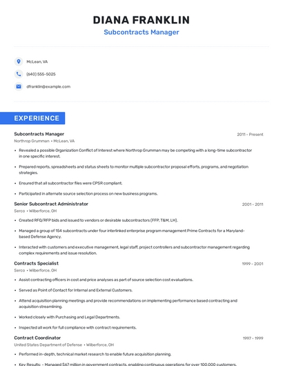 Build a professional subcontracts manager resume in minutes. Browse through our resume examples to identify the best way to word your resume. Then choose from 5+ resume templates to create your subcontracts manager resume.