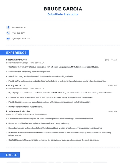 Build a professional substitute instructor resume in minutes. Browse through our resume examples to identify the best way to word your resume. Then choose from 5+ resume templates to create your substitute instructor resume.