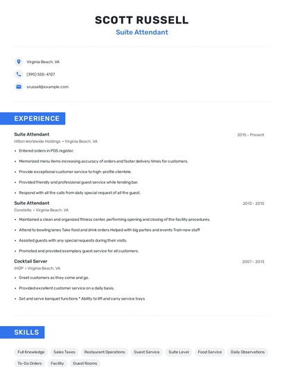 Build a professional suite attendant resume in minutes. Browse through our resume examples to identify the best way to word your resume. Then choose from 5+ resume templates to create your suite attendant resume.