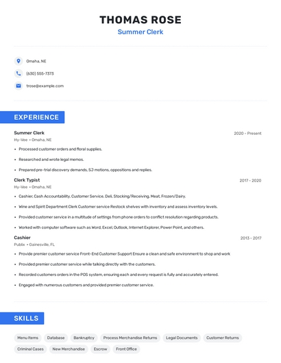 Build a professional summer clerk resume in minutes. Browse through our resume examples to identify the best way to word your resume. Then choose from 5+ resume templates to create your summer clerk resume.
