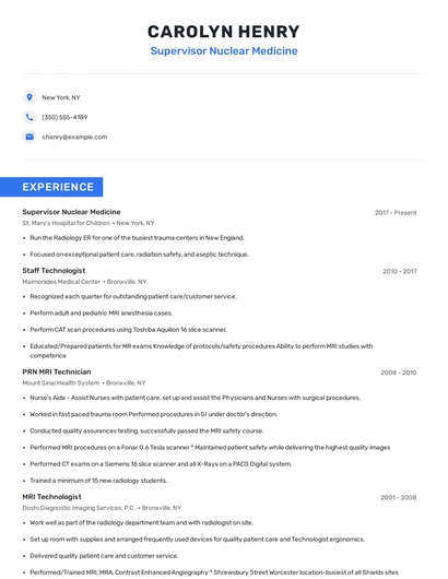 Build a professional supervisor nuclear medicine resume in minutes. Browse through our resume examples to identify the best way to word your resume. Then choose from 5+ resume templates to create your supervisor nuclear medicine resume.