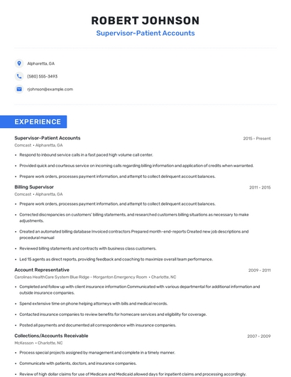 Build a professional supervisor-patient accounts resume in minutes. Browse through our resume examples to identify the best way to word your resume. Then choose from 5+ resume templates to create your supervisor-patient accounts resume.