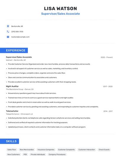 Build a professional supervisor/sales associate resume in minutes. Browse through our resume examples to identify the best way to word your resume. Then choose from 5+ resume templates to create your supervisor/sales associate resume.