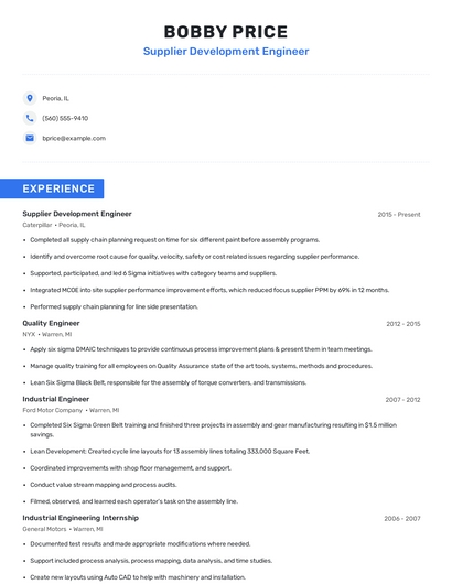 Build a professional supplier development engineer resume in minutes. Browse through our resume examples to identify the best way to word your resume. Then choose from 5+ resume templates to create your supplier development engineer resume.