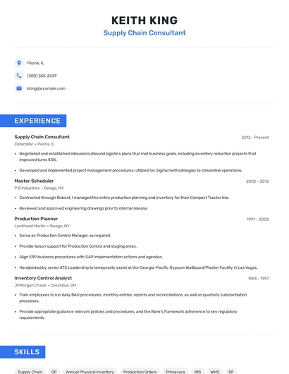 Build a professional supply chain consultant resume in minutes. Browse through our resume examples to identify the best way to word your resume. Then choose from 5+ resume templates to create your supply chain consultant resume.