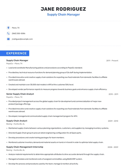 Build a professional supply chain manager resume in minutes. Browse through our resume examples to identify the best way to word your resume. Then choose from 5+ resume templates to create your supply chain manager resume.